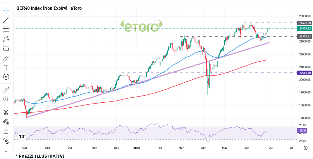 Il principale indice tedesco ha trovato supporto nella media mobile a 50 periodi (Ema50) e potrebbe dirigersi verso la soglia dei 24500 punti, che è il prossimo livello di resistenza per il .