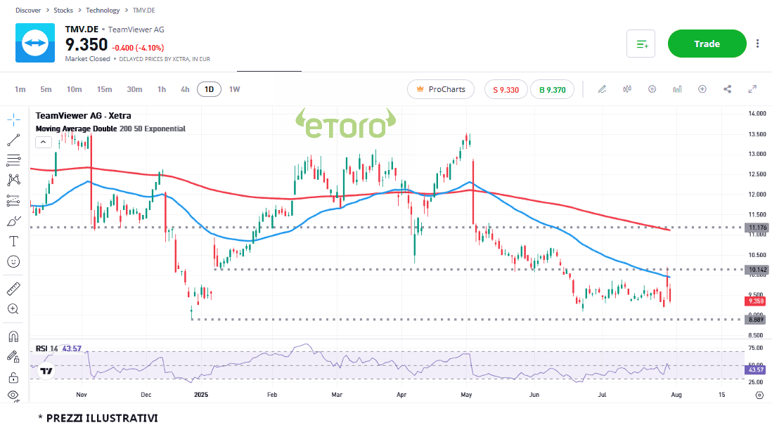 Lo scenario grafico di TeamViewer evideniza che, dopo un periodo di forte debolezza, ci sono i primi segnali di stabilizzazione. Come puoi vedere sulla piattaforma di investimento eToro, il titolo sta infatti oscillando tra 9,54 e 10 euro da alcune settimane.